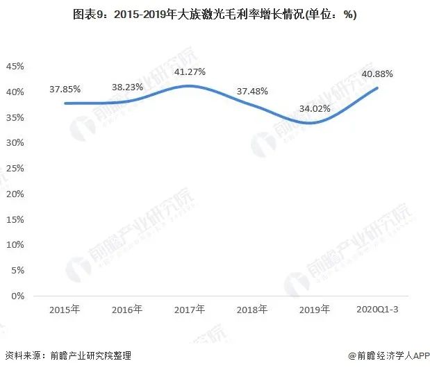 2015-2019年大族激光毛利率整體在35%以上水平,2019年略有下降,主要是受產(chǎn)品銷售結(jié)構(gòu)及市場競爭加劇的影響,導(dǎo)致公司綜合毛利率較2018年度下降約3.46個百分點;但是2020年前三季度上升為40.88%。