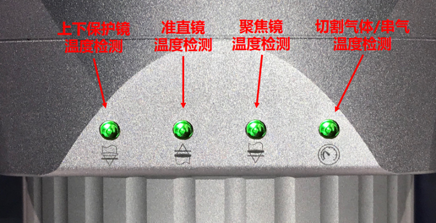 在切割頭的核心關(guān)鍵部位,嵌入了相應(yīng)的精密傳感器,實(shí)時(shí)監(jiān)控切割頭核心區(qū)域工作狀態(tài),并通過(guò)切割頭上的的四個(gè)三色(紅綠黃)LED燈以3種閃爍狀態(tài)(常亮、閃爍、快速閃爍)實(shí)時(shí)顯示??捎行б?guī)避因其他異常導(dǎo)致對(duì)切割頭元器件近一步損傷,使異??梢暬?,讓干預(yù)提前介入,從而降低損失。同時(shí),通過(guò)收集監(jiān)控?cái)?shù)據(jù),可為產(chǎn)品進(jìn)一步優(yōu)化提供參考。