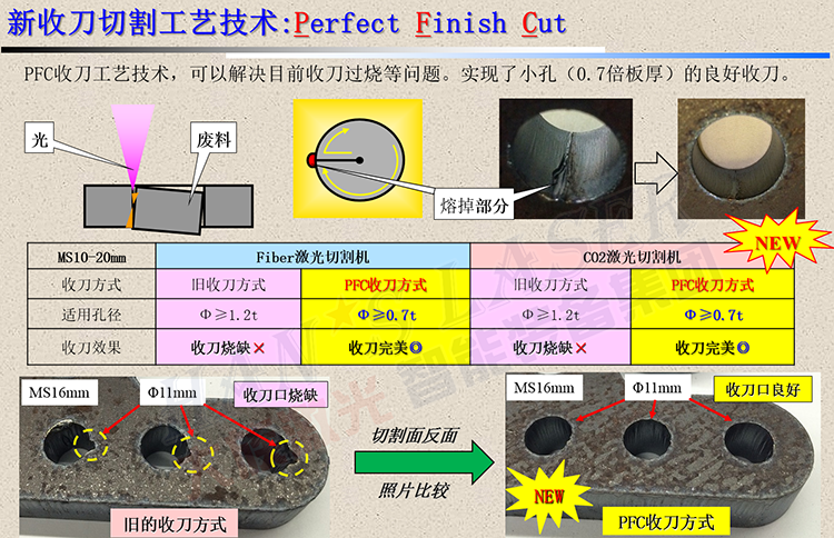 碳鋼厚板切割時,在收刀處經(jīng)常出現(xiàn)過熔現(xiàn)象,嚴重影響工件品質(zhì),對精密要求高的客戶來說決不容許的。PFC收刀工藝技術,可以解決目前收刀過燒等問題。實現(xiàn)了小孔(0.7倍板厚)的良好收刀。