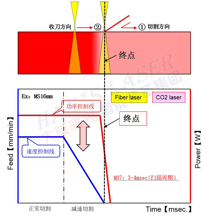 原因是切割部分發(fā)生的熱會比切割速度更快地向前傳達,比光束先行的熱在到收刀口附近,由于熱傳導的關系,收刀口處的熱沒地方擴散,處于高溫狀態(tài)。這時輔助氣體氧氣的供給會使收刀口激烈燃燒以致燒缺。