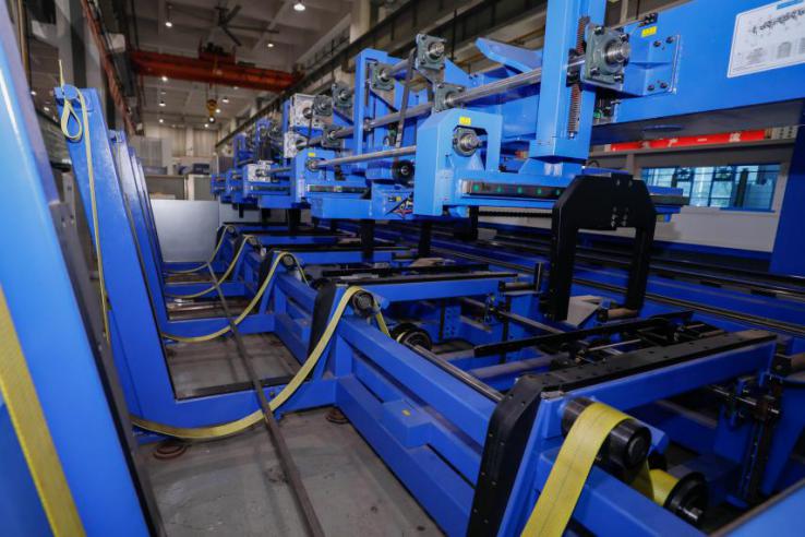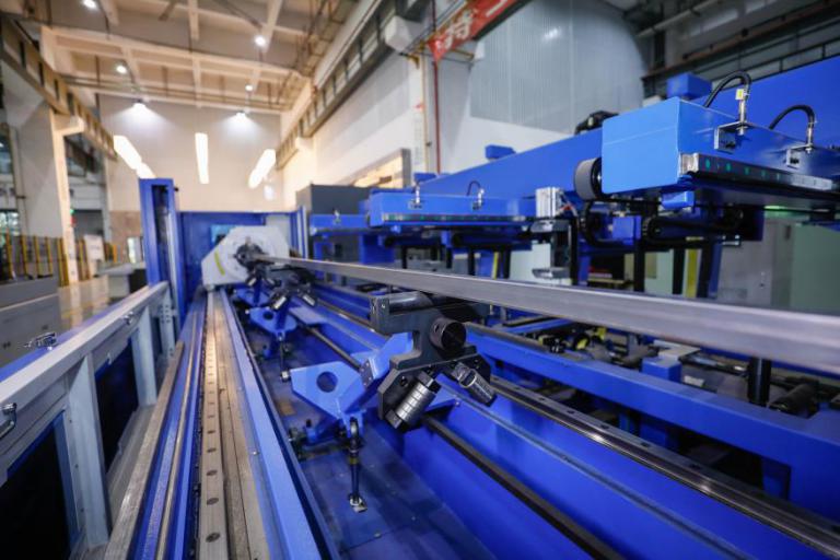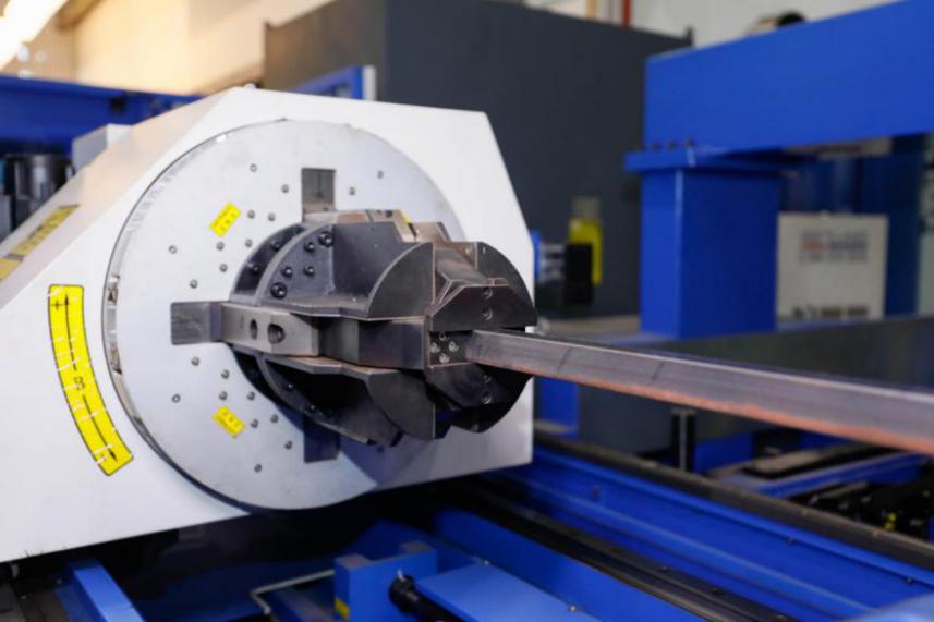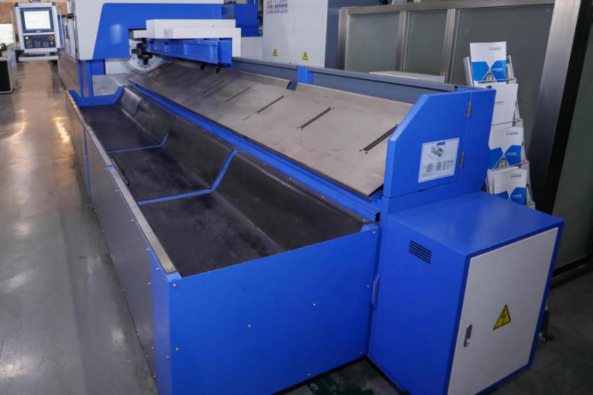改進(jìn)后的夾持系統(tǒng),由兩組滑板、數(shù)控旋轉(zhuǎn)臺和四爪對抓自定心氣動夾頭組成,其中一組移動(X軸),另一組固定在床身上。通過大族智控數(shù)控系統(tǒng)控制交流伺服電機(jī)驅(qū)動送料夾頭,實(shí)現(xiàn)X軸方向的快速移動和送料,完成上料、切割送料。四爪自定心對抓氣動夾頭采用氣動夾緊。兩個夾爪聯(lián)動,實(shí)現(xiàn)自定心功能;兩對對抓卡爪單獨(dú)運(yùn)動,實(shí)現(xiàn)對不同形狀管材的自定心夾緊。改進(jìn)后的夾緊氣缸不再隨夾頭旋轉(zhuǎn),無密封漏氣風(fēng)險,最大夾緊重量提高到200公斤,夾緊后有反饋信號,且可以自動檢測管材規(guī)格,并與程序進(jìn)行比較,判斷是否上錯管材,實(shí)現(xiàn)對不同長度,不同形狀管材的定位、夾緊和比對。