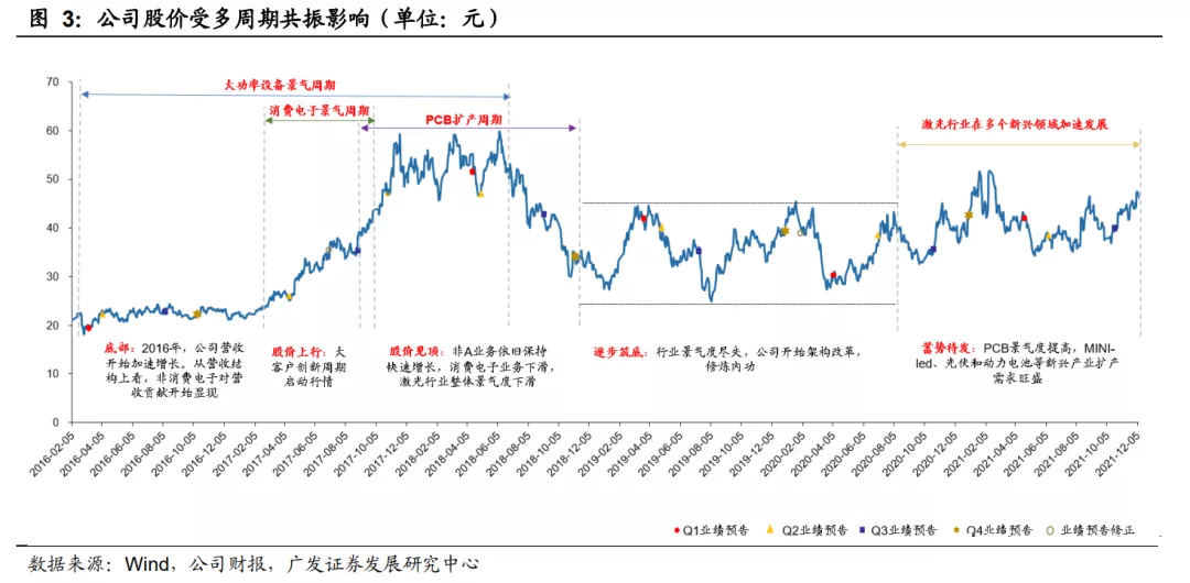 從歷史趨勢(shì)來看,公司業(yè)務(wù)受到下游周期性影響。復(fù)盤公司歷史業(yè)績,公司整體收入呈現(xiàn)典型的多周期共振特點(diǎn),受到宏觀驅(qū)動(dòng)的激光設(shè)備周期、PCB產(chǎn)業(yè)擴(kuò)產(chǎn)周期、大客戶新產(chǎn)品周期以及新興產(chǎn)業(yè)擴(kuò)產(chǎn)周期影響。