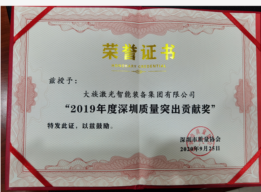 峰會(huì)期間,大族激光智能裝備集團(tuán)被授予“深圳質(zhì)量引領(lǐng)先進(jìn)示范單位”、“2019年度深圳質(zhì)量突出貢獻(xiàn)獎(jiǎng)”,以表彰其在深圳先行示范區(qū)的高質(zhì)量發(fā)展進(jìn)程中發(fā)揮的優(yōu)秀企業(yè)示范作用與顯著貢獻(xiàn)。